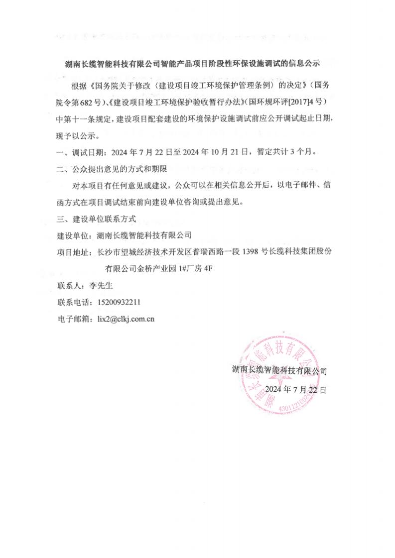 湖南長(zhǎng)纜智能科技有限公司智能產(chǎn)品項(xiàng)目階段性環(huán)保設(shè)施調(diào)試的信息公示