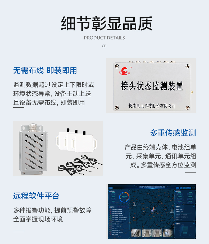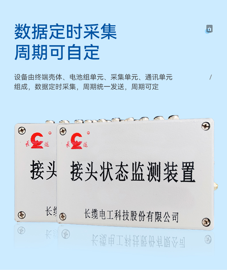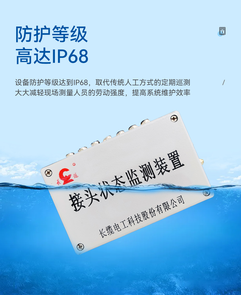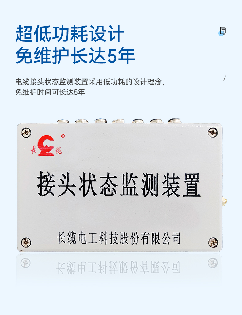 電纜接頭狀態(tài)監(jiān)測(cè)裝置具備溫度(點(diǎn)測(cè)溫)、震動(dòng)、水浸等監(jiān)測(cè)功能,可用于電纜接頭溫度監(jiān)測(cè)、接地線狀態(tài)(偷盜)監(jiān)測(cè)、環(huán)境水浸情況監(jiān)測(cè)(接頭是否泡水)等場(chǎng)合。