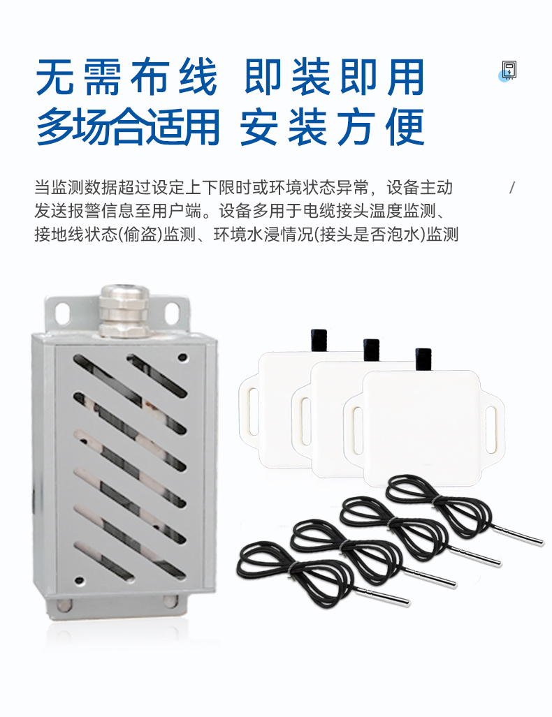 ? 可用于電纜接頭溫度監(jiān)測(cè)、接地線狀態(tài)(偷盜)監(jiān)測(cè)、環(huán)境水浸情況監(jiān)測(cè)(接頭是否泡水)等場(chǎng)合。