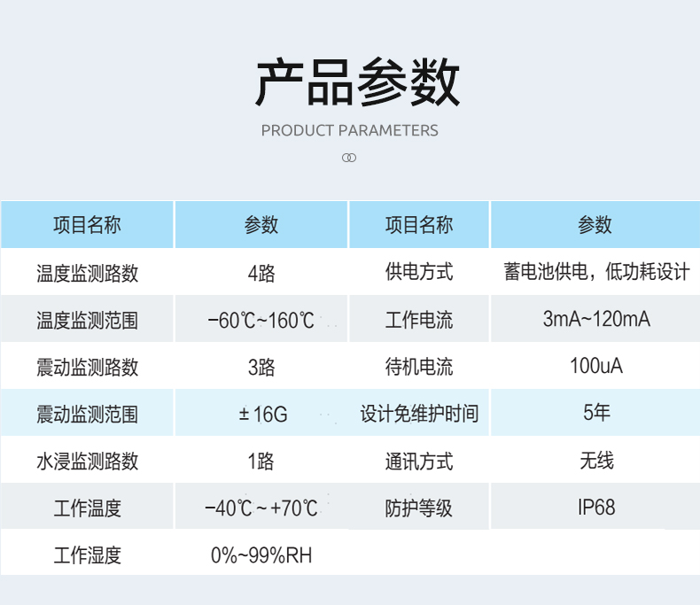 產(chǎn)品由終端殼體、電池組單元、采集單元、通訊單元組成。采用低功耗的設(shè)計(jì)理念,數(shù)據(jù)定時(shí)采集,周期統(tǒng)一發(fā)送,當(dāng)監(jiān)測(cè)數(shù)據(jù)超過(guò)設(shè)定上下限時(shí)或環(huán)境狀態(tài)異常,設(shè)備主動(dòng)發(fā)送報(bào)警信息至用戶端。設(shè)備無(wú)需布線,即裝即用。
