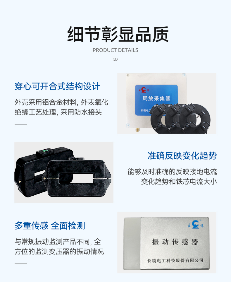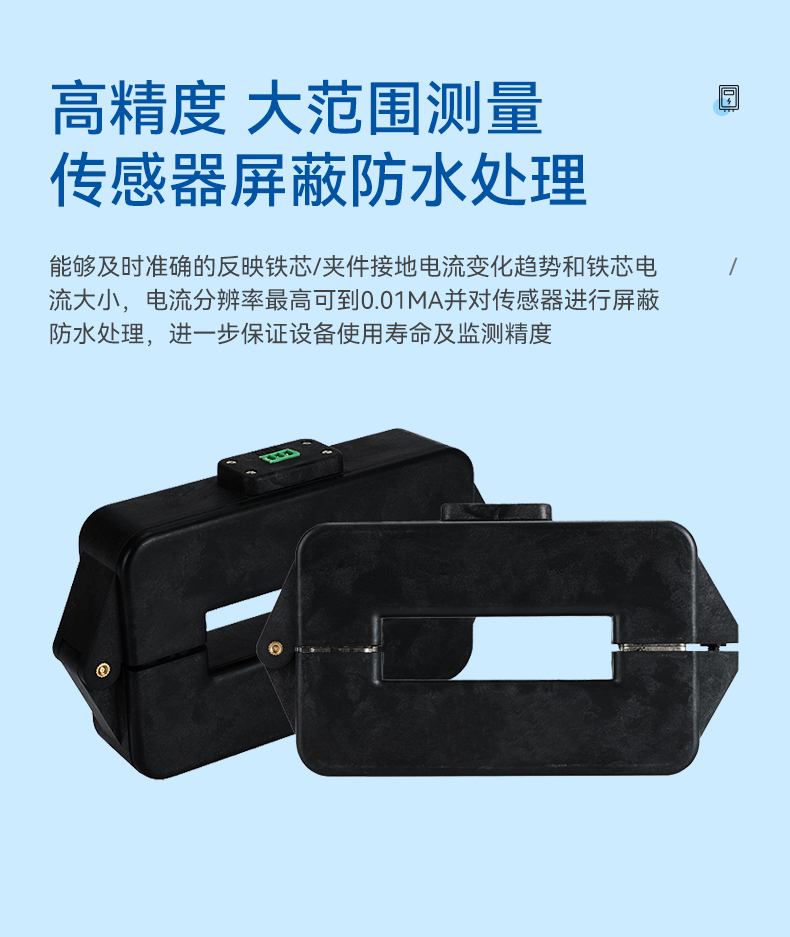 ? 監(jiān)測數(shù)據(jù)準確可靠:采用高精度穿心式電流傳感器,能夠及時準確的反映鐵芯/夾件接地電流變化趨勢和鐵芯電流大小,同時保證高精度和大范圍測量,電流分辨率最高可到0.01mA并對傳感器進行屏蔽防水處理,進一步保證設備使用壽命及監(jiān)測精度。