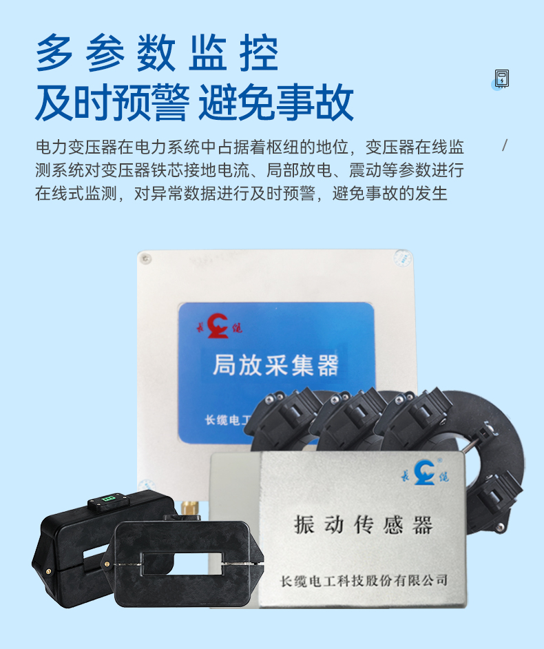 電力變壓器在電力系統(tǒng)中占據(jù)著權紐的地位,一旦出現(xiàn)故障,可能導致大面積停電,變壓器在線監(jiān)測系統(tǒng)對變壓器鐵芯接地電流、局部放電、震動等參數(shù)進行在線式監(jiān)測,對異常數(shù)據(jù)進行及時預警,及早發(fā)現(xiàn)避免事故的發(fā)生。