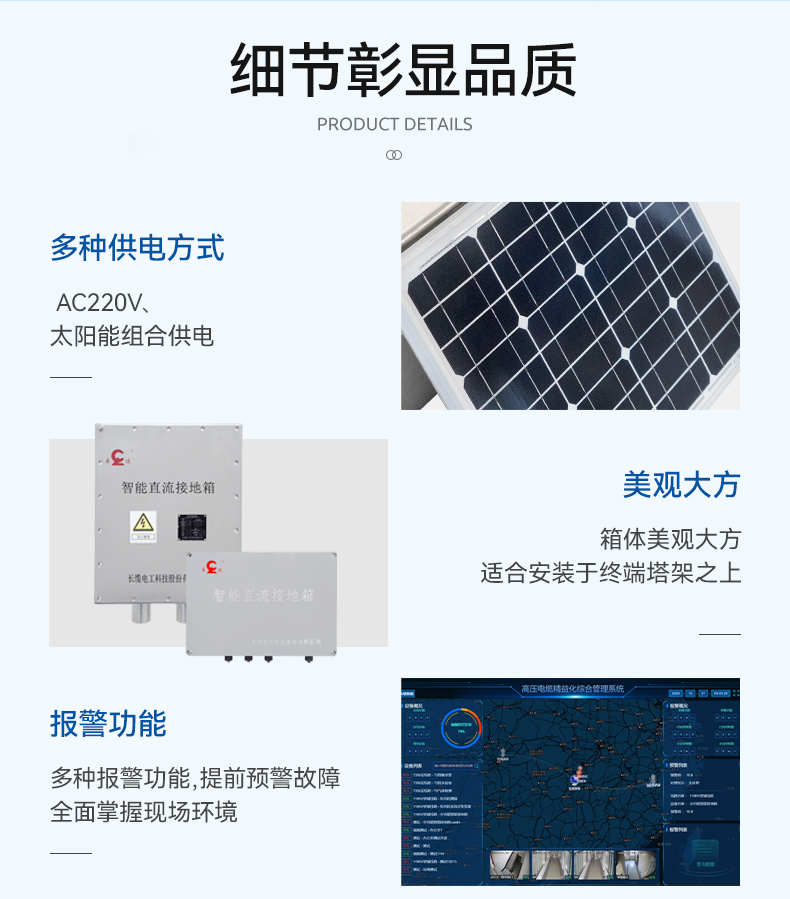 智能直流接地箱實(shí)時(shí)監(jiān)測(cè)直流電纜接地泄漏電流、電纜表面溫度等參數(shù)來(lái)輔助判斷電纜線路的運(yùn)行情況;實(shí)現(xiàn)綜合監(jiān)測(cè)、運(yùn)維的智能化、自動(dòng)化,保障直流電纜本體、設(shè)備、運(yùn)維人員安全。